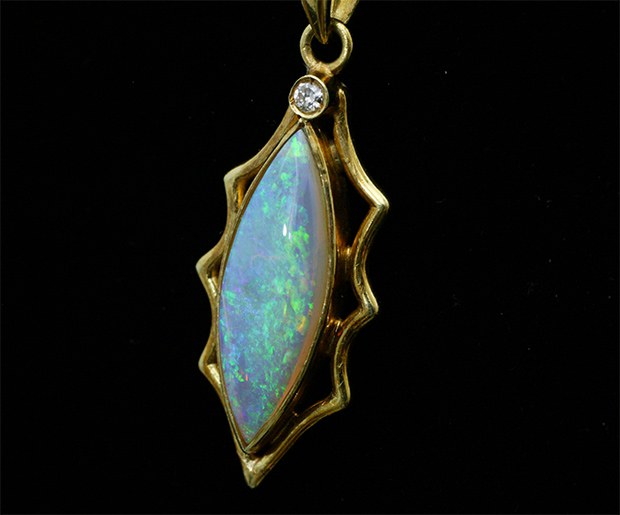 美しいマーキーズシェイプ のオパールのペンダント。オパールのみでも2.2cm×0.8cm(全体2.8cm×1.3cm )と充分な大きさがあります。オパールは様々な色が混ざり合っているのが特徴ですが、このオパールは青と緑の色味が強く出ている石です、光や角度によって 色の濃さや色味が変わるのがとても幻想的ですね。こうして首から下げた時の存在感も充分あります。お値段もとても控えめなので、オパールのペンダントをお 探しの方にはとてもお勧めです。