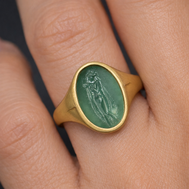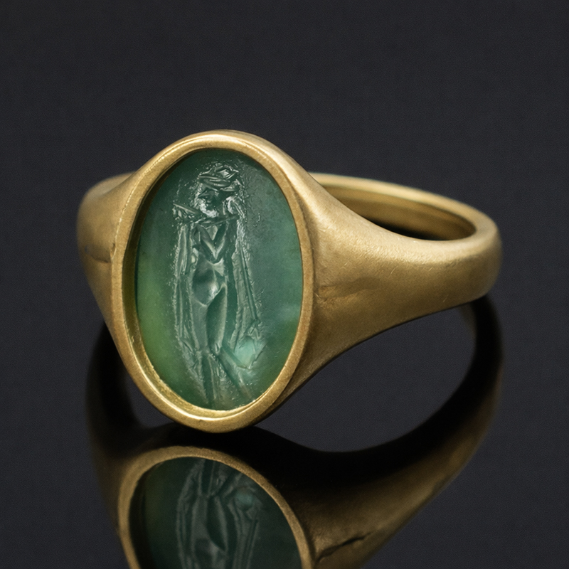 古代ギリシャ神話における酩酊の女神メテが彫り込まれた珍しいインタリオ です。
