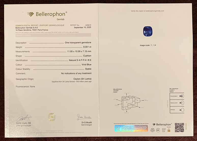 ベルレロフォン宝石研究所の鑑別書(No. A24610/2025年9月10日付)により、