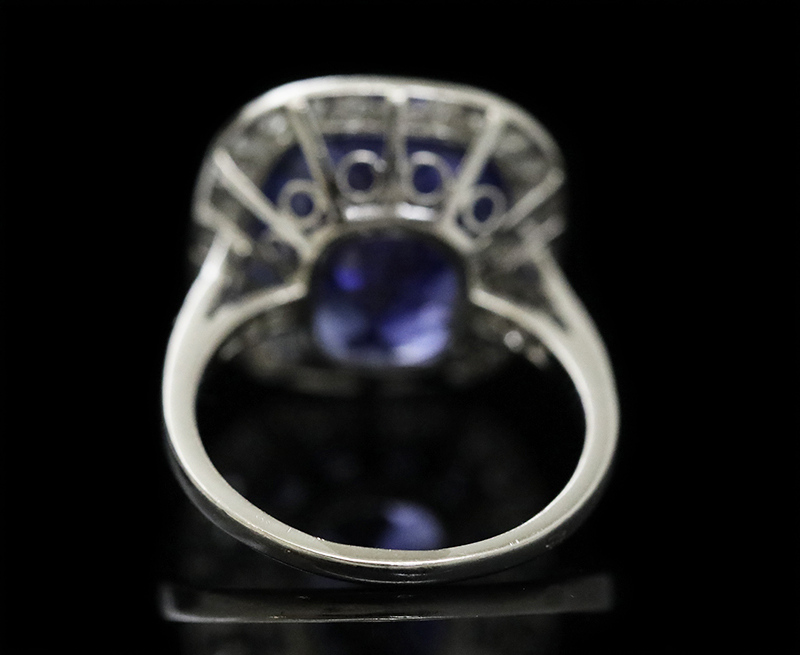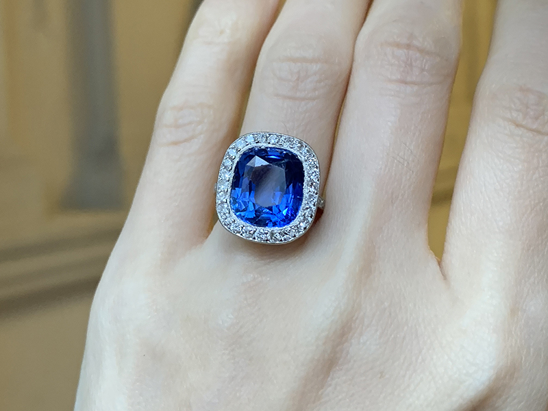 サファイアはクッションカットで深く鮮やかなブルーを湛え結晶構造はほぼ完璧で、