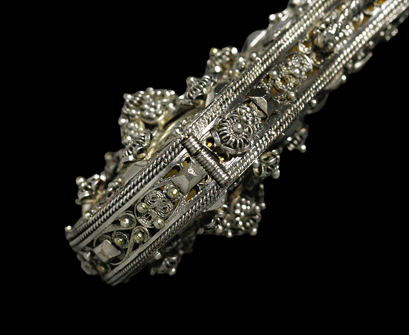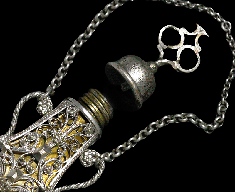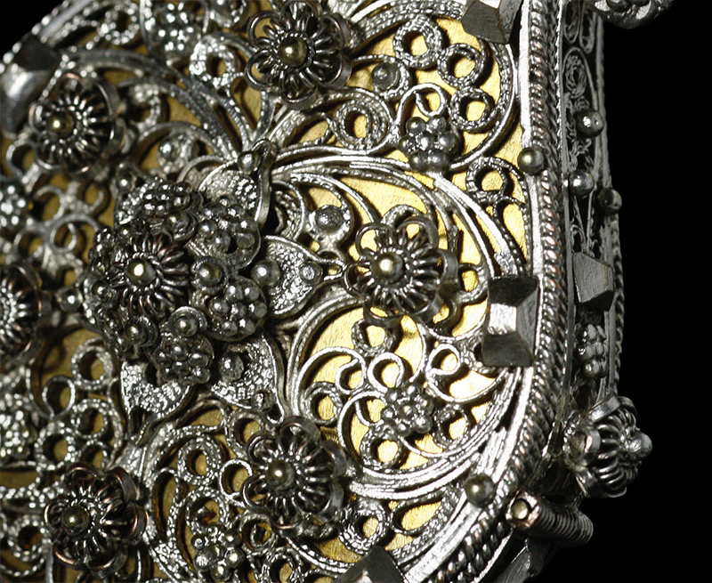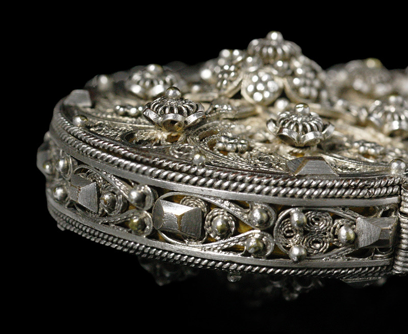 繊細なフィリグリー(透かし細工)と粒金細工によって全面を飾られた18〜19世紀の香水入れです。