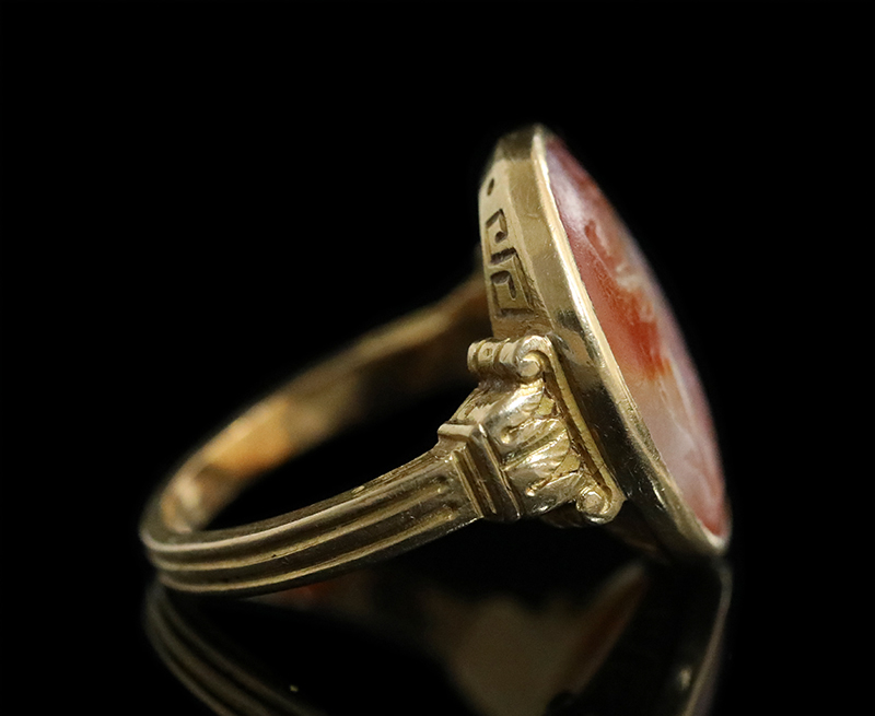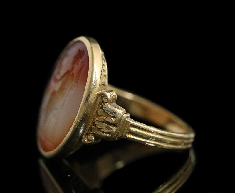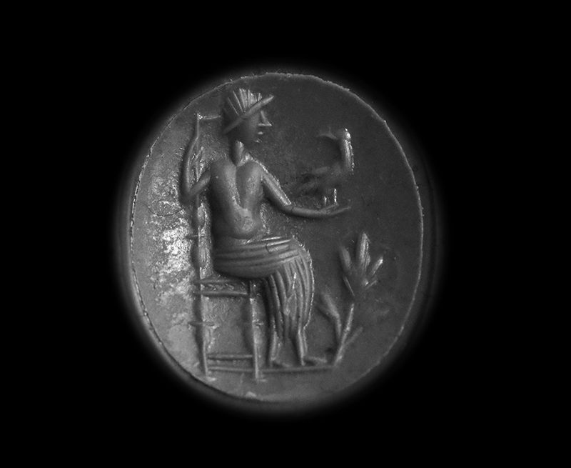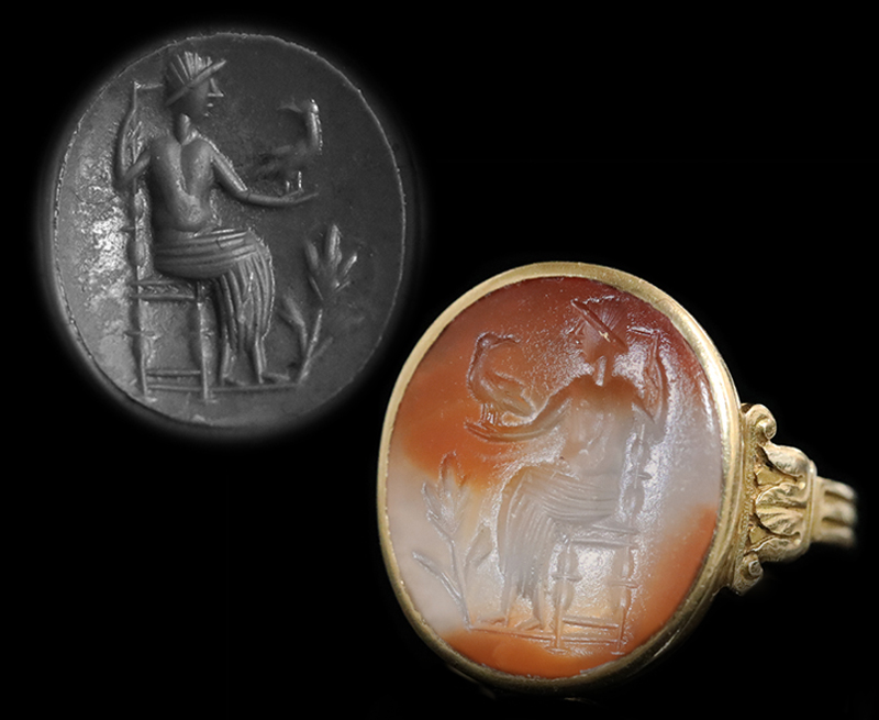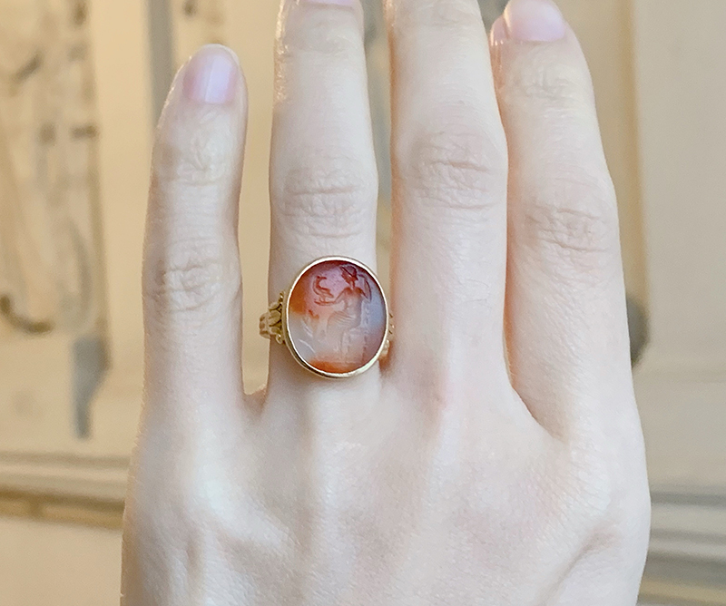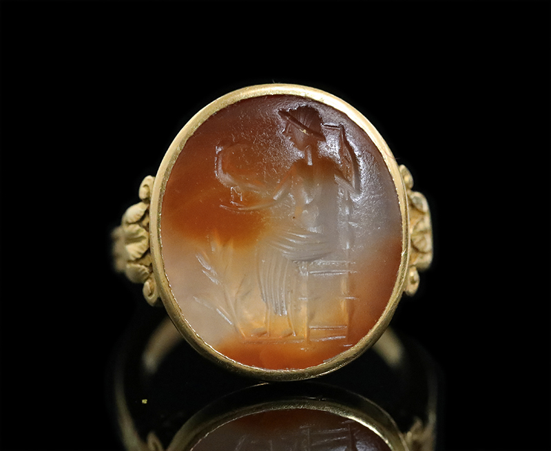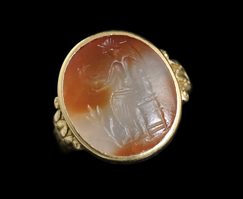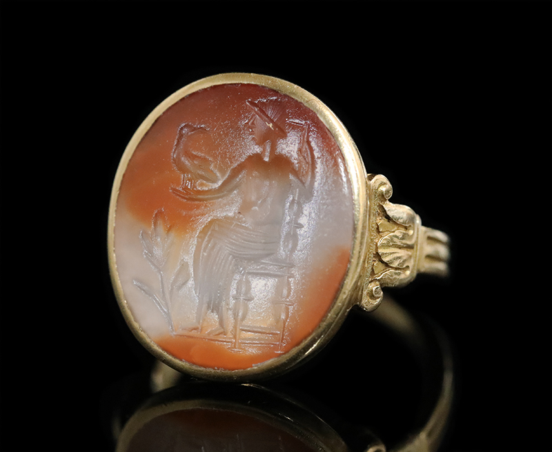 柔らかな光をたたえるオレンジとホワイトの瑪瑙に静かに腰掛けるゼウスの姿が刻まれた1世紀頃のインタリオ です。
