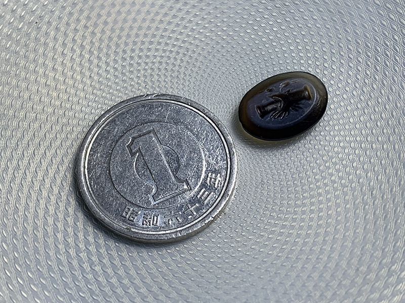 青い層が光の加減でやわらかく浮かび上がるニコロ石に、古代の人々が大切にした精神がそっと宿るインタリオです。