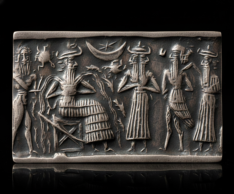 この印章の主題は、最高神エンリルの所有する「運命の書板(天命のタブレット)」を盗み出し