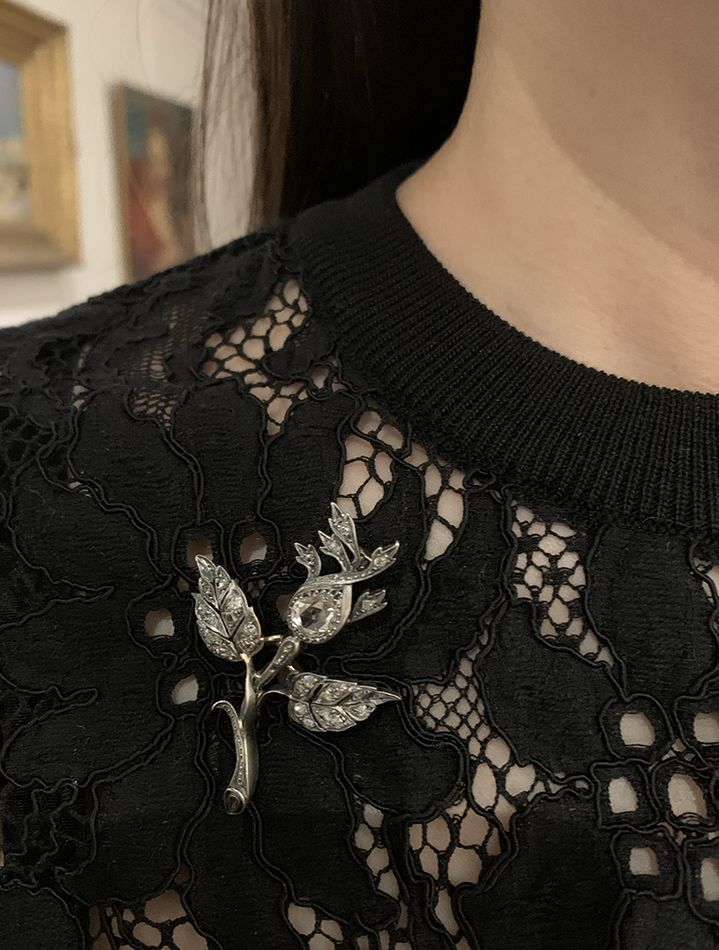 花や葉の部分には小さなダイヤモンドが丁寧に留められ銀細工による立体的な葉脈と相まって、