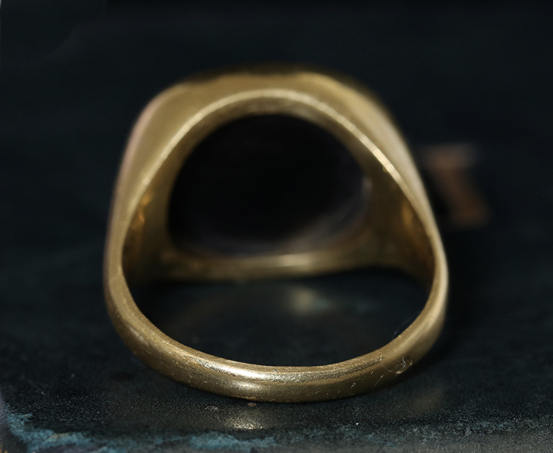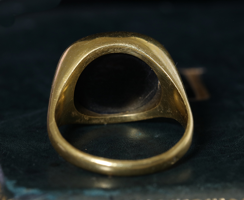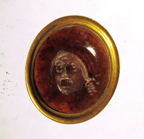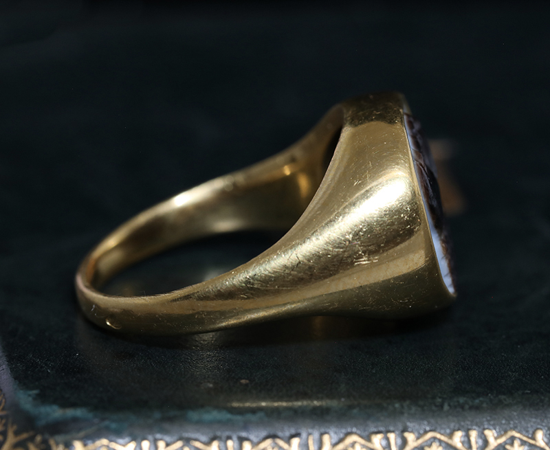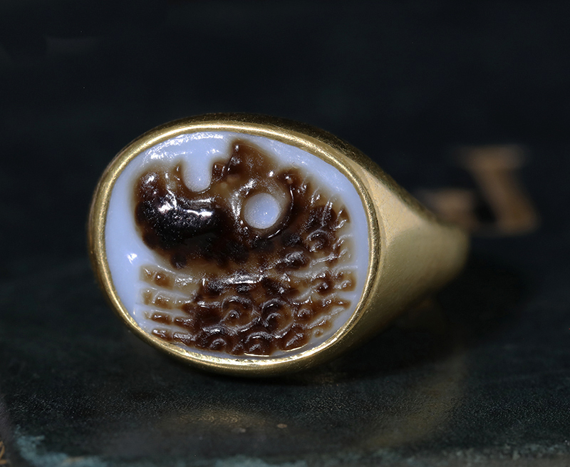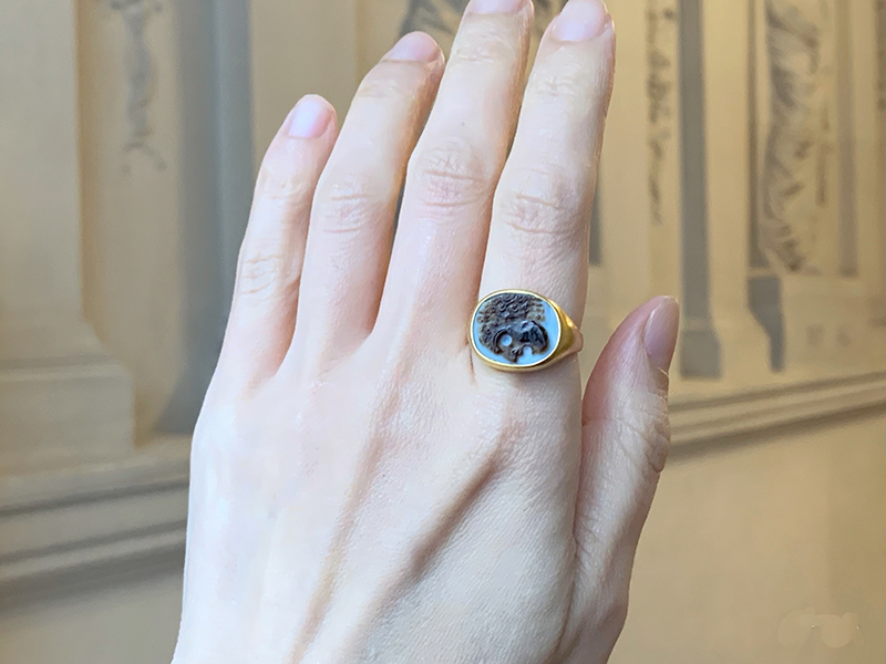 楕円形のベゼルの18kのリングに、きわめて稀少なローマ時代の二層アゲート・カメオがセットされています。