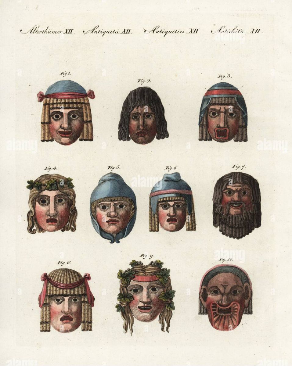 古代の仮面(ギリシャの悲劇/喜劇、ローマのバッカス祭の仮面)をテーマにした手彩色銅版画の図版。