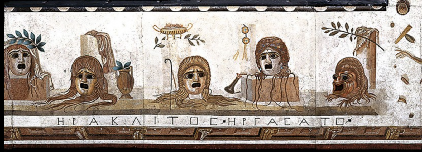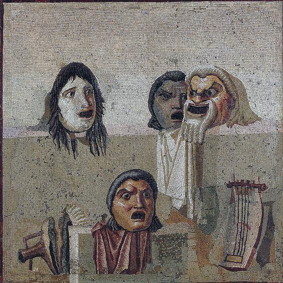 演劇の仮面と楽器(竪琴など)を描いた古代ローマのモザイク