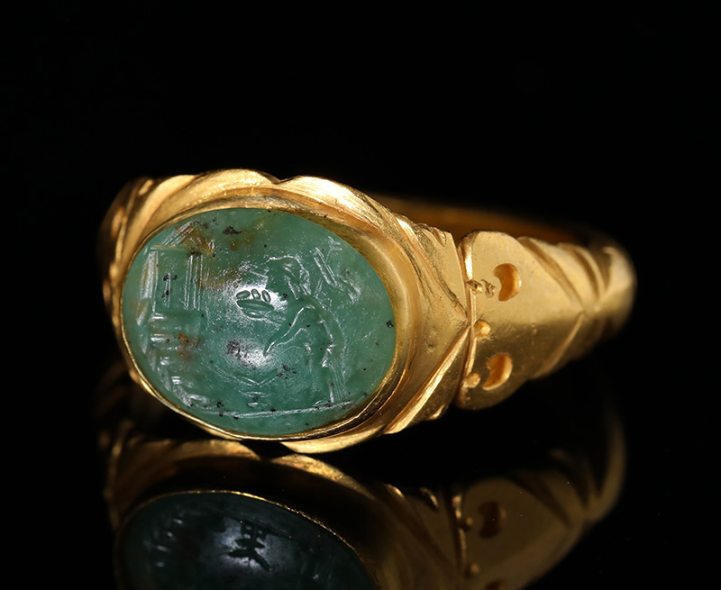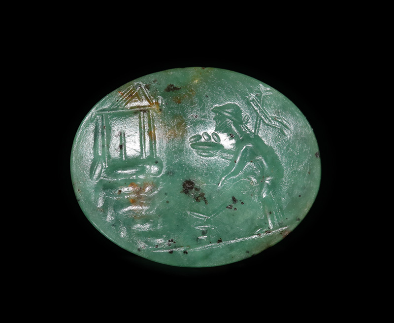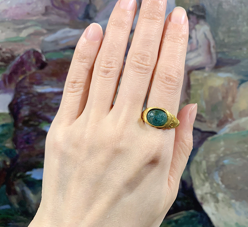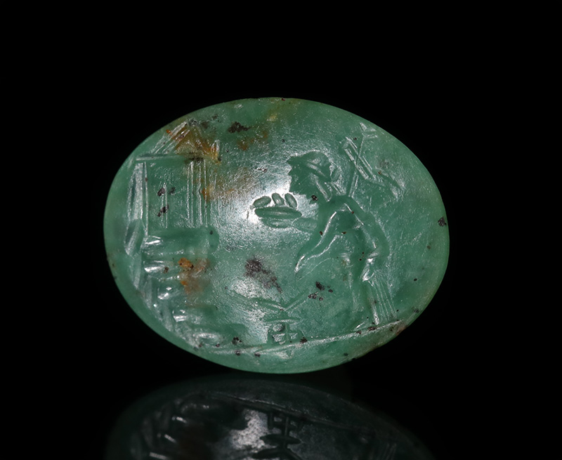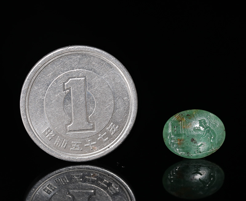 青リンゴのような、まろやかな緑をたたえたプラスマに彫られた古代ローマのインタリオです。