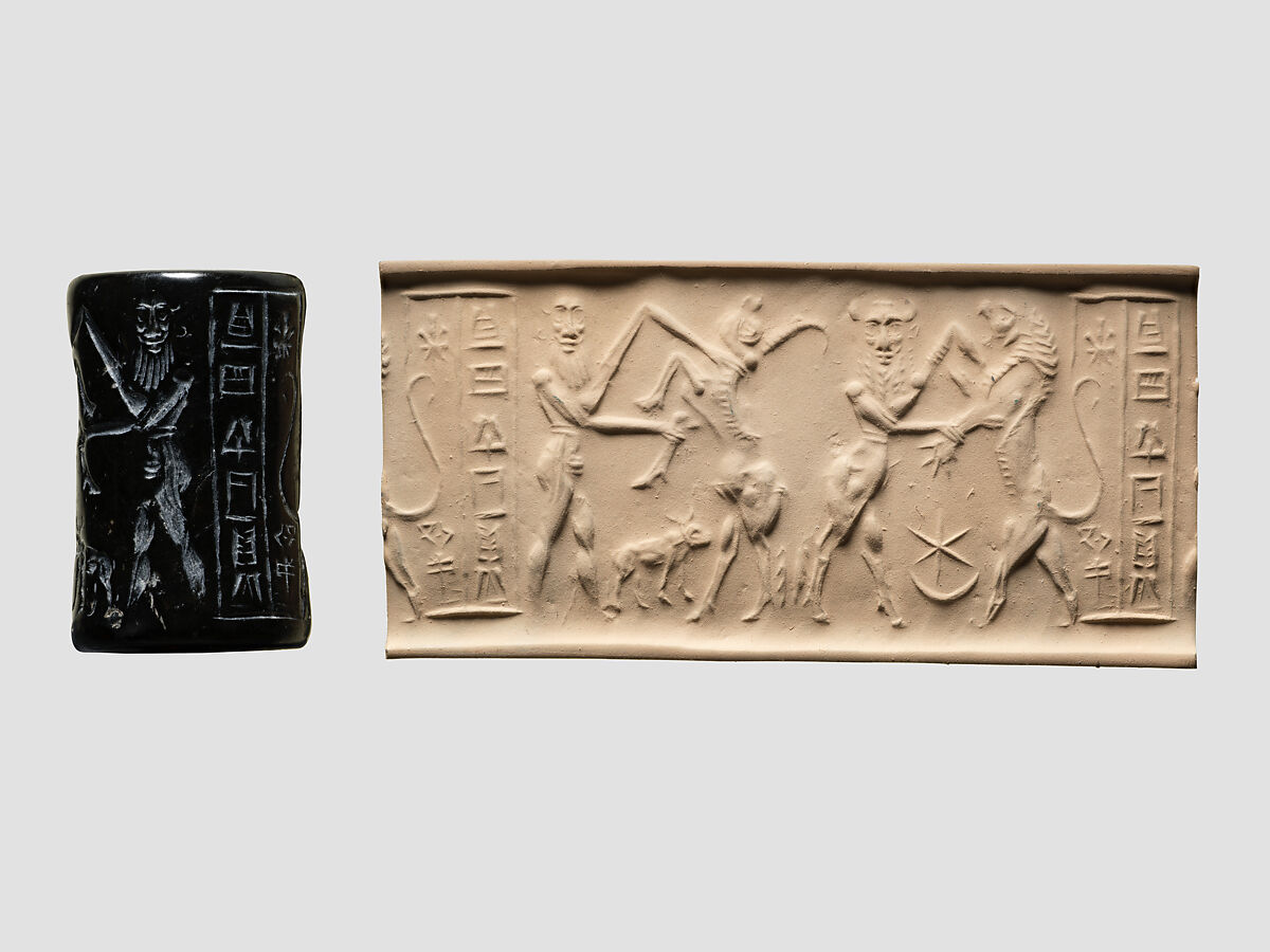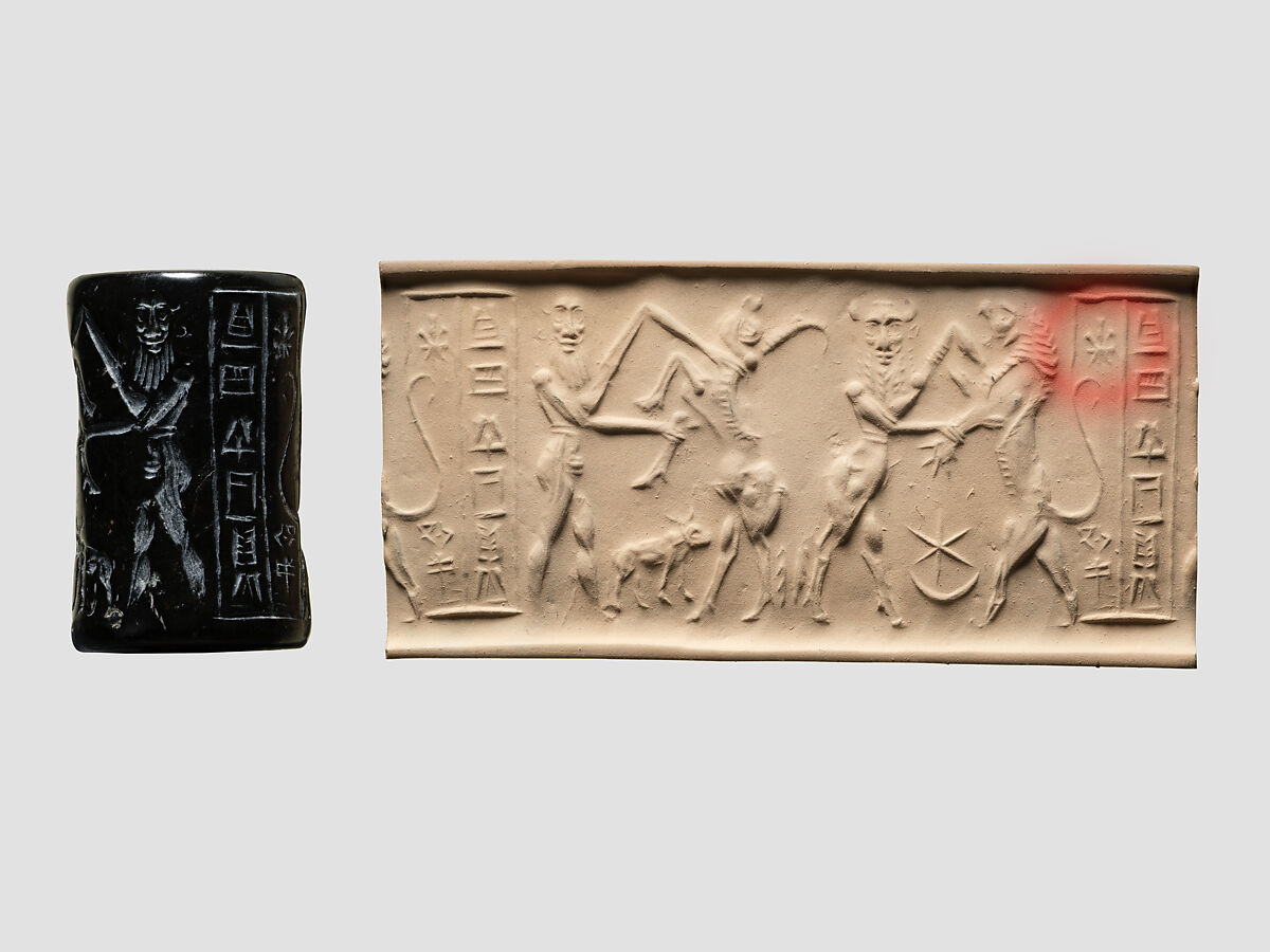 アッカド期の特徴的なモチーフである闘争図の円筒印章で