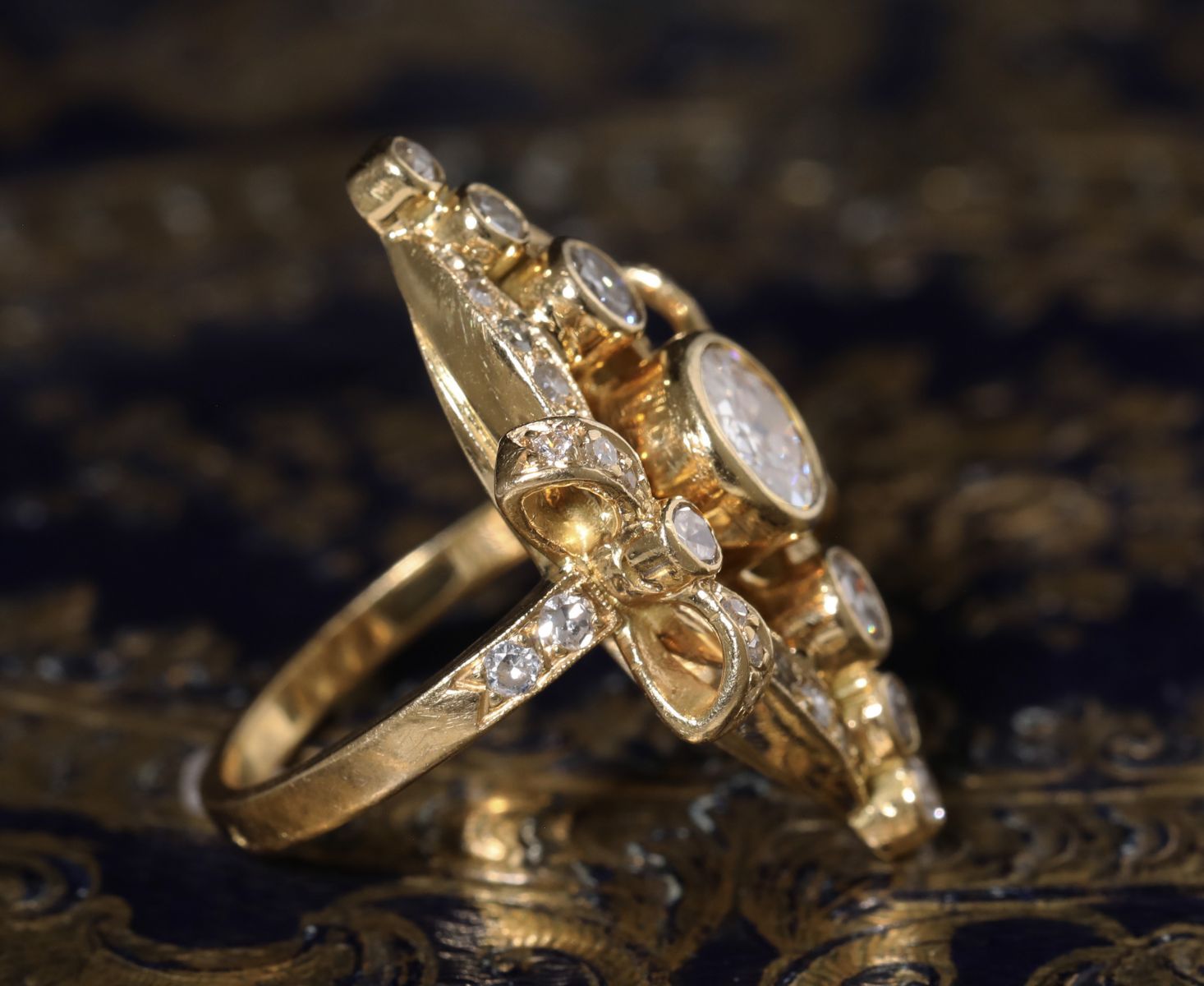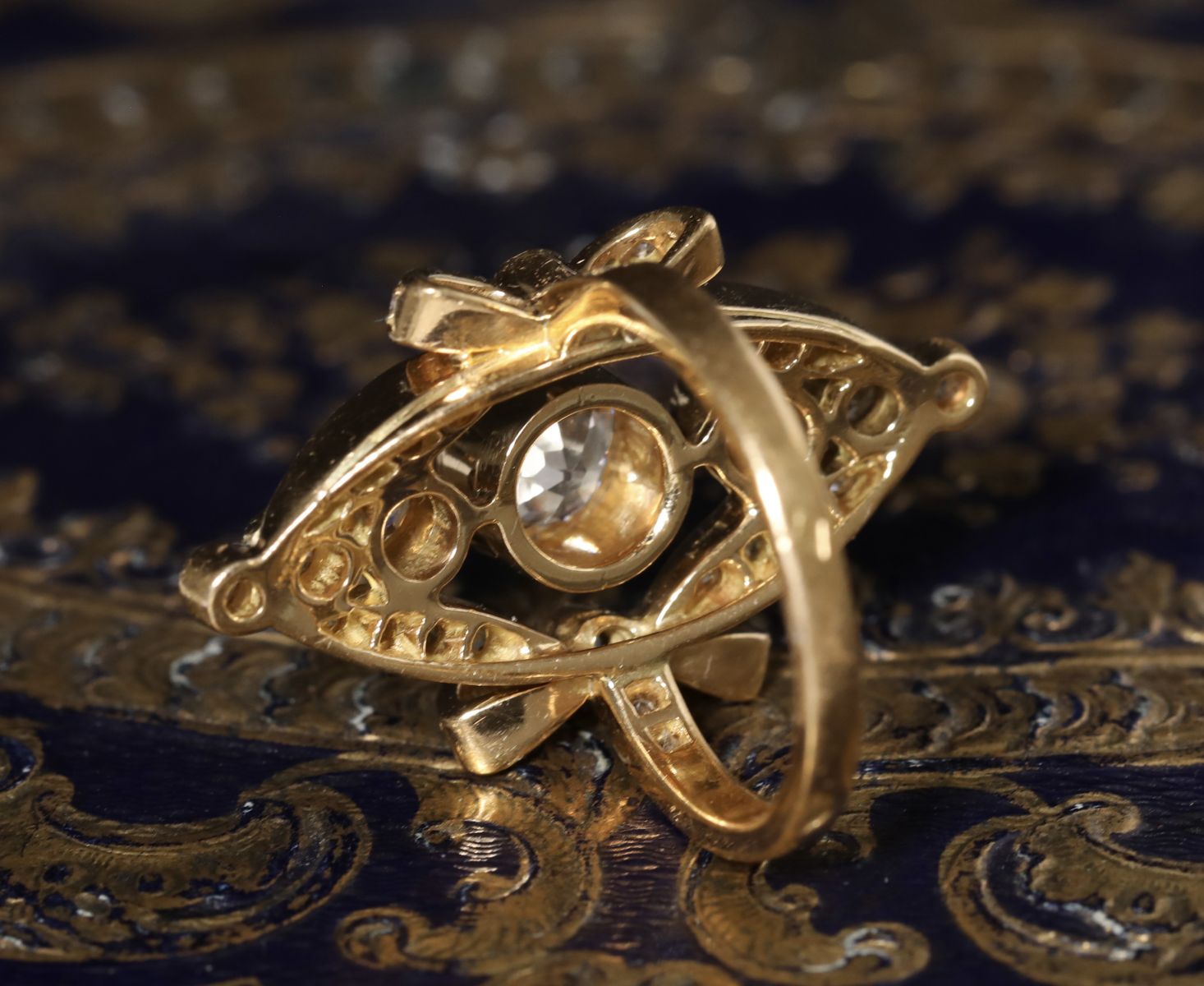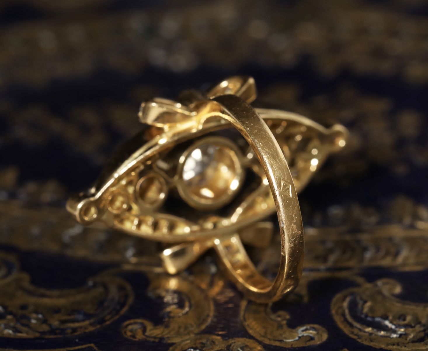 マーキーズシェイプのデザインで両脇にリボンを結んだベルエポックのリングです。