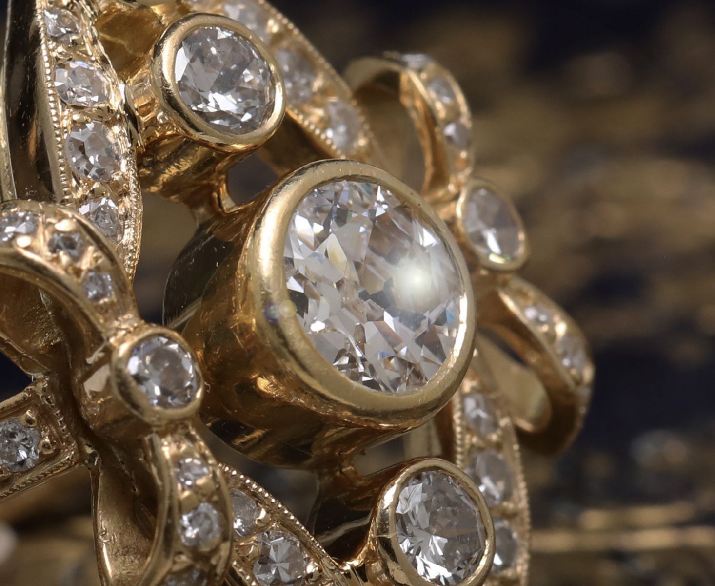 中心には大粒のダイヤモンドを覆輪留めでふっくらと据え、周囲には大小のダイヤモンドをリズミカルに配置し、