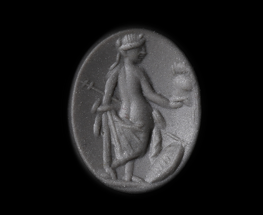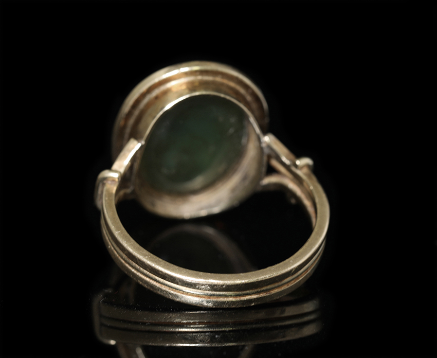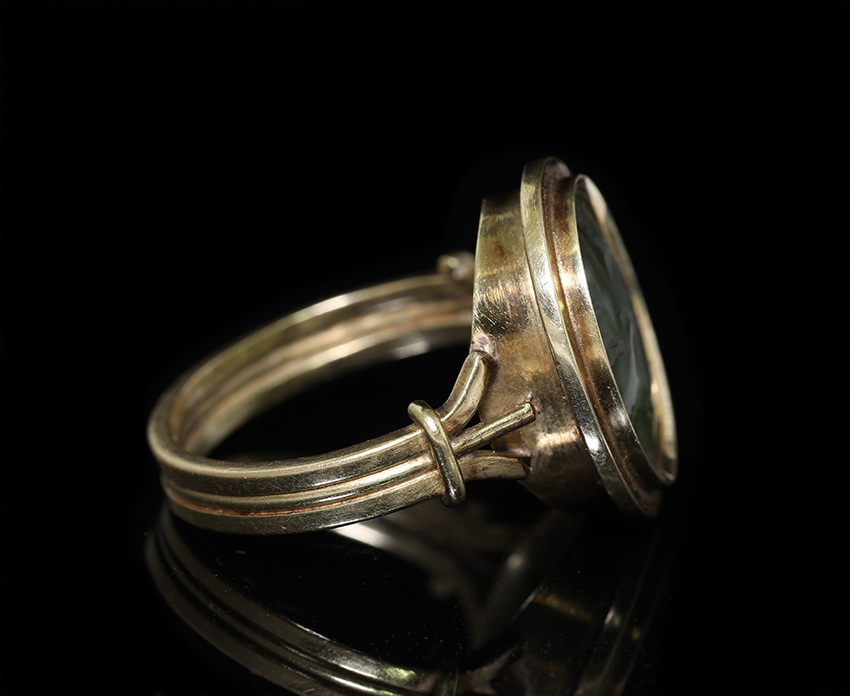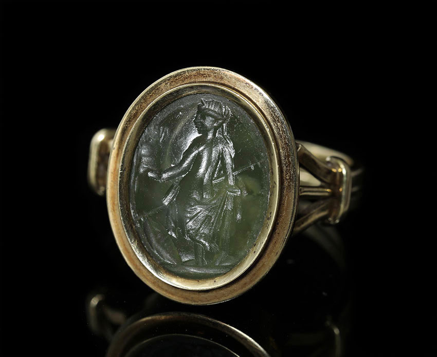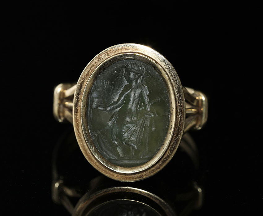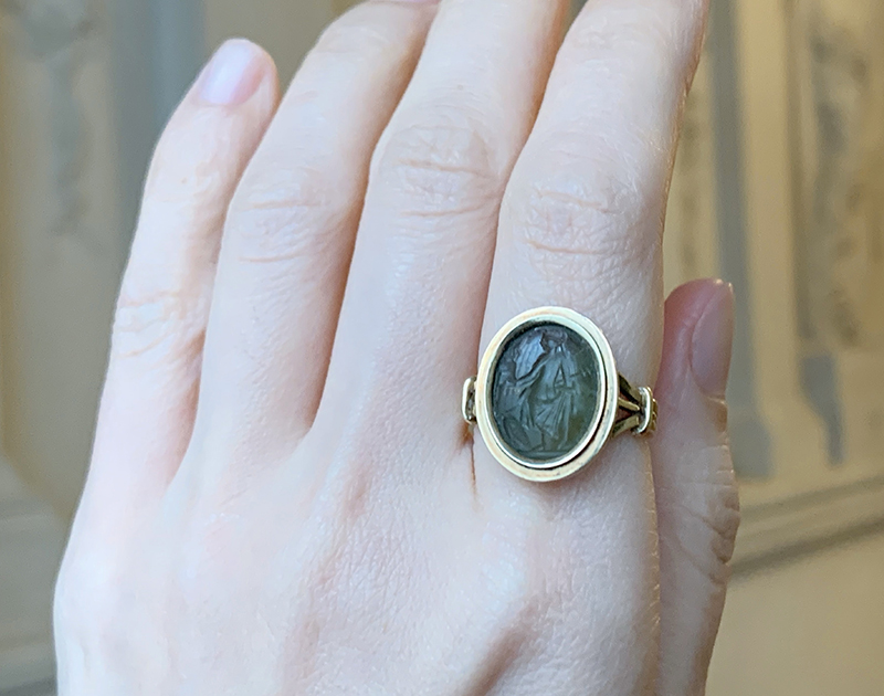 オーバル型のベゼルには、プラスマに彫られた古代ローマ1世紀のインタリオが嵌め込まれています。