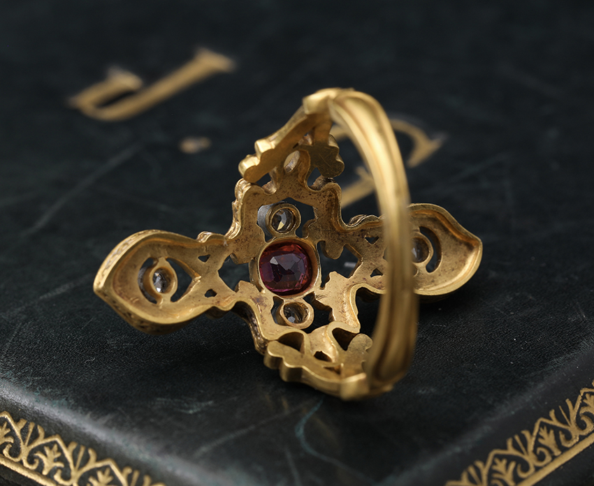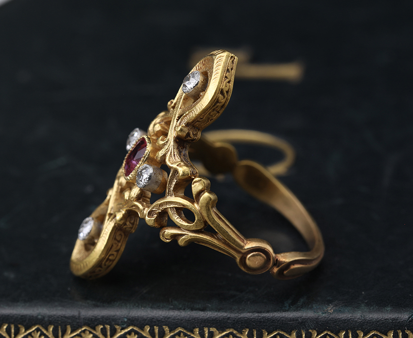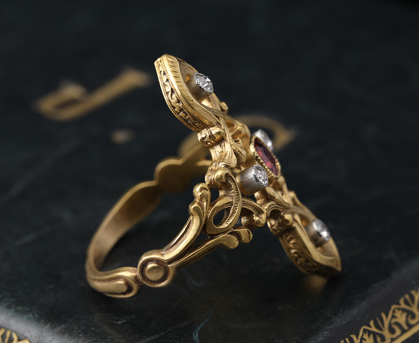 18kで仕立てられた、ネオゴシック様式のマーキーズシェイプのリングです。