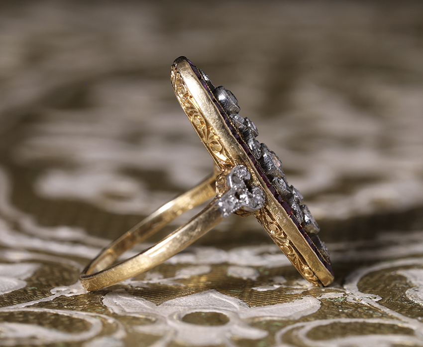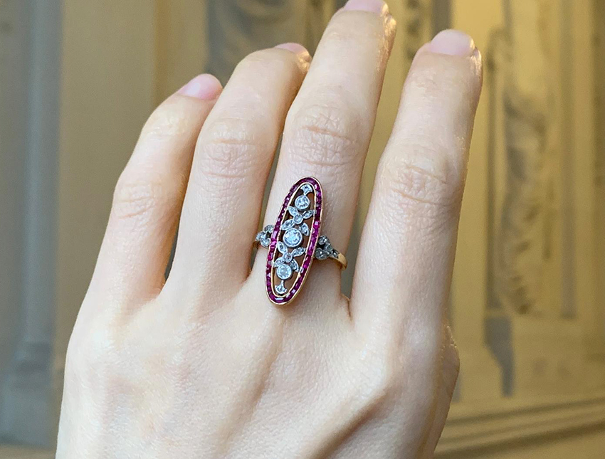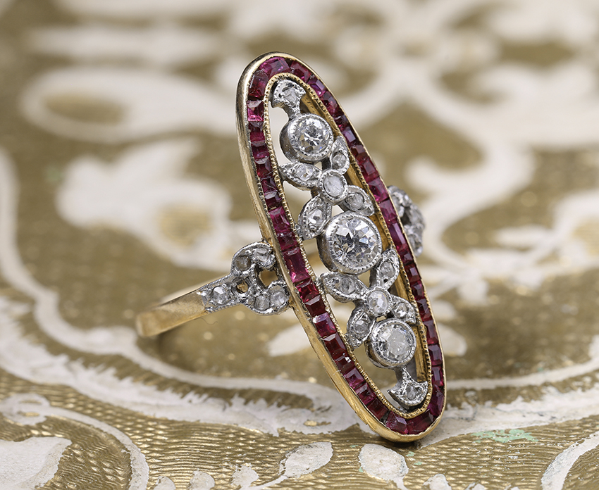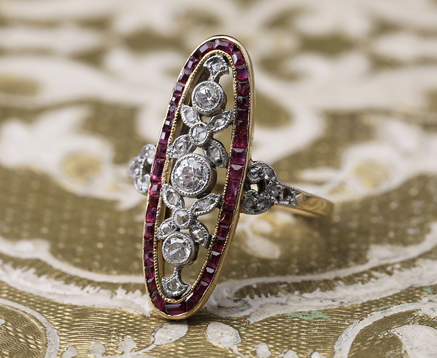 ベルエポック様式 マーキーズシェイプ ダイヤモンド&カリブレカットルビー リング