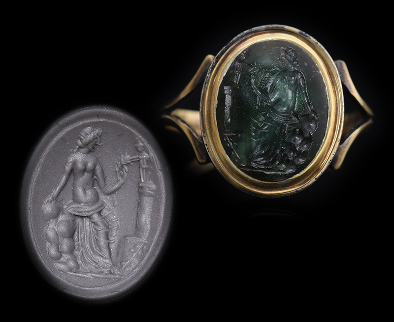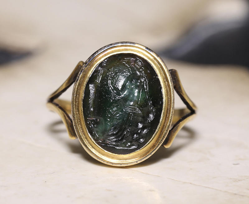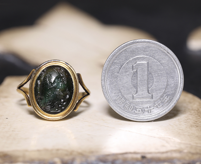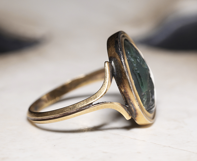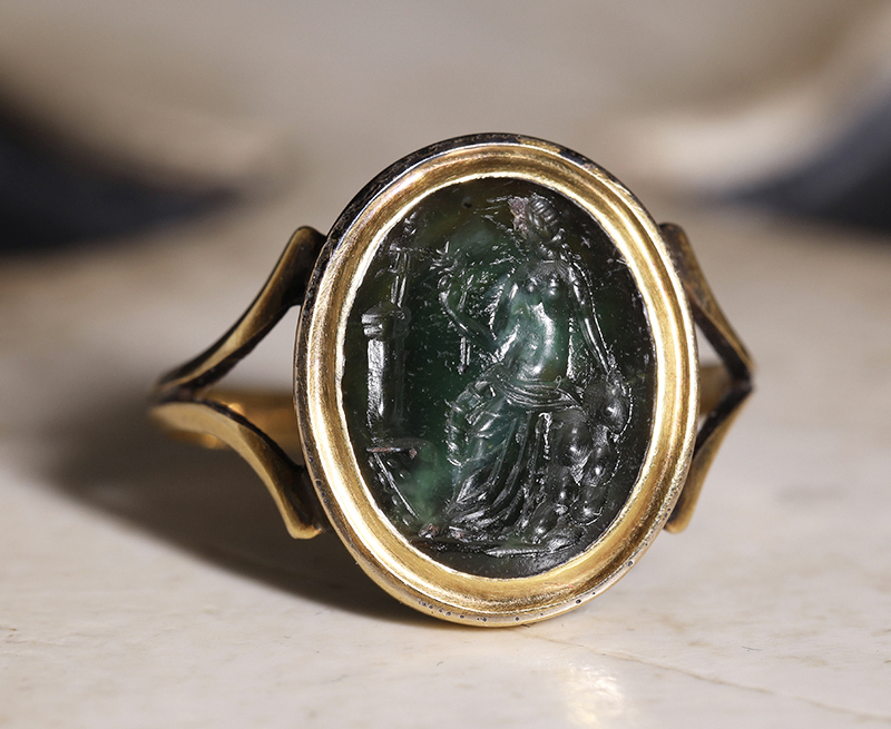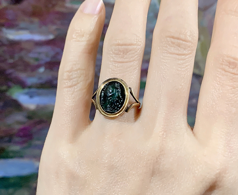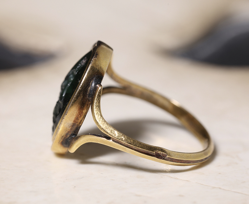 古代ローマ1世紀のプラスマ(plasma)に彫られたインタリオを、19世紀中期のリングにセットした作品です。