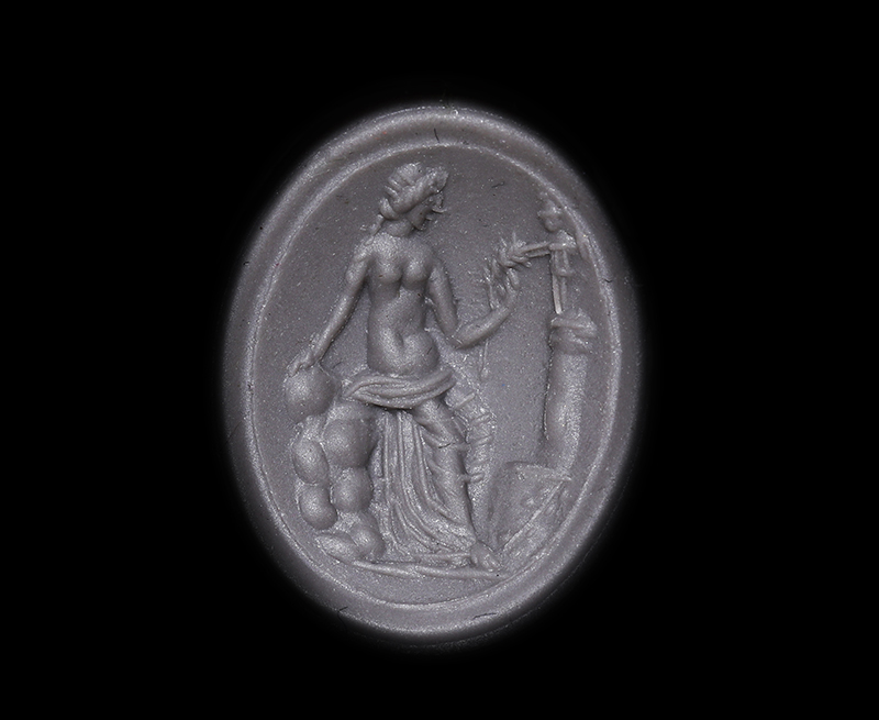 小さな画面の中に、衣や髪の表現まで丁寧に彫り込まれた、見どころの多い素晴らしい構図のインタリオです。