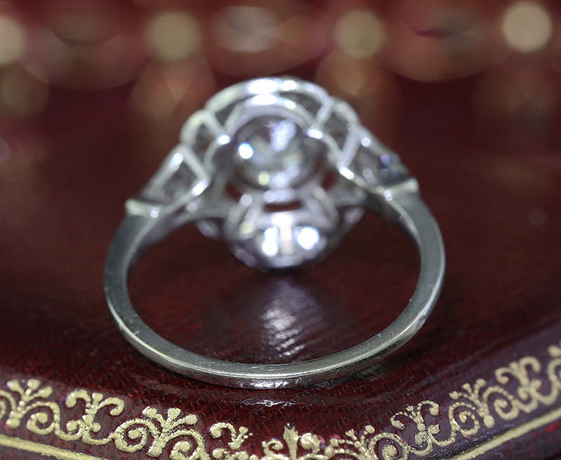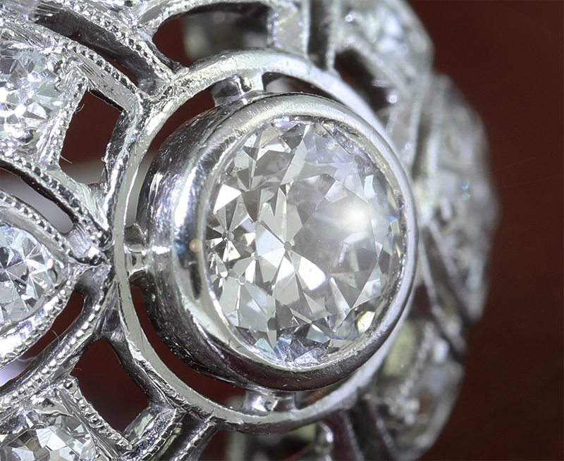 中央にセットされたダイヤモンドを囲むように周囲にもダイヤモンドを配し、
