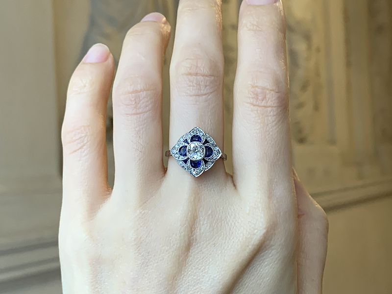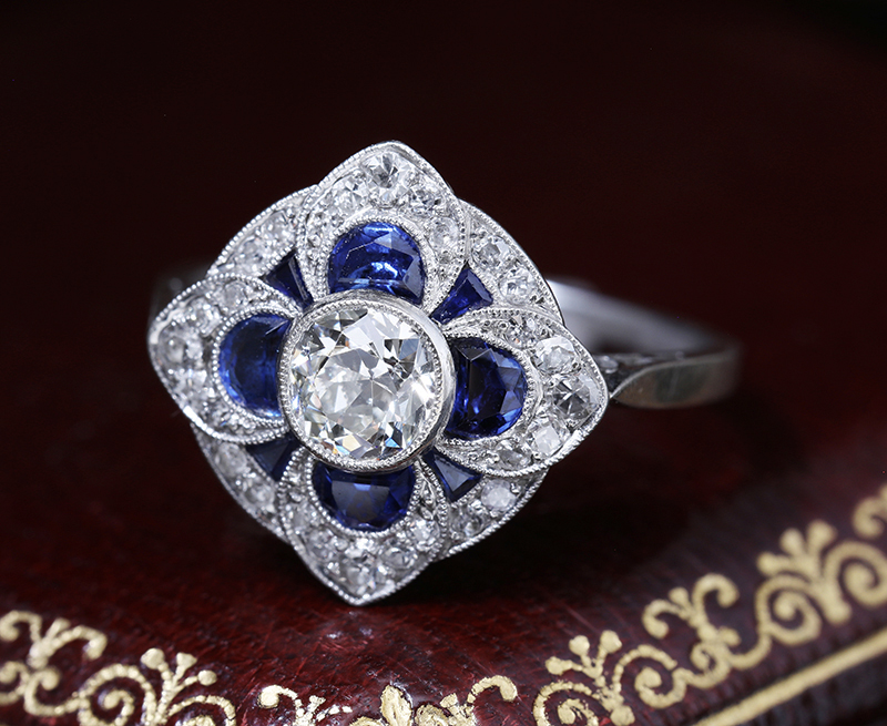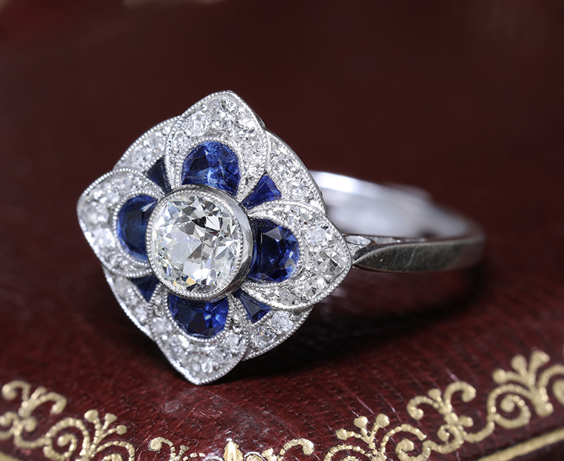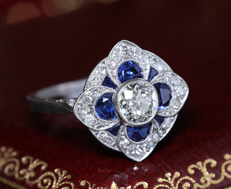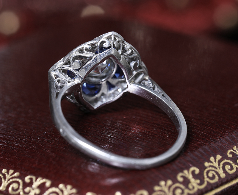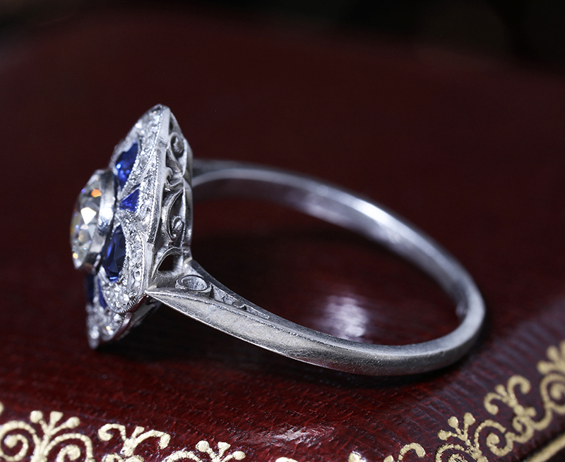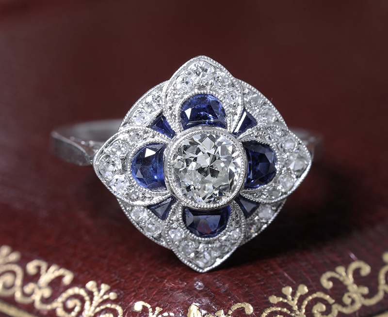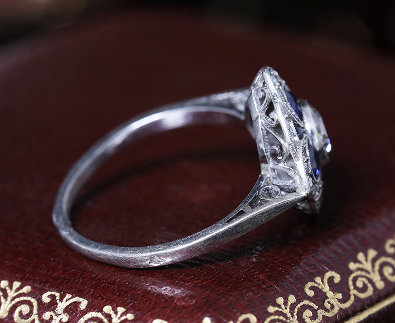アールデコらしい端正な幾何学美が印象的なプラチナ製のサファイヤ&ダイヤモンドリングです。