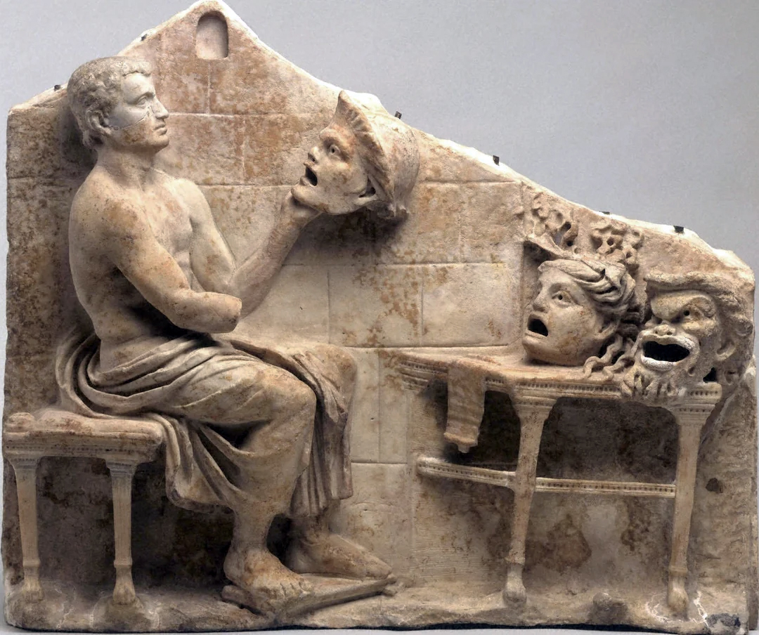 彫りこまれているのは岩に腰かけトガをまとい正面に掲げた劇場の仮面を見つめる劇俳優の姿です。