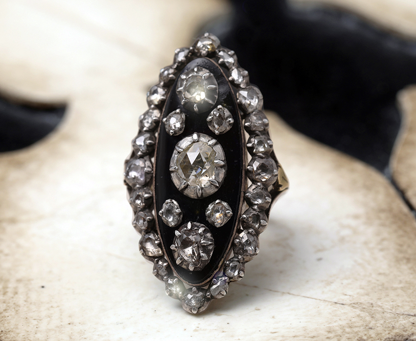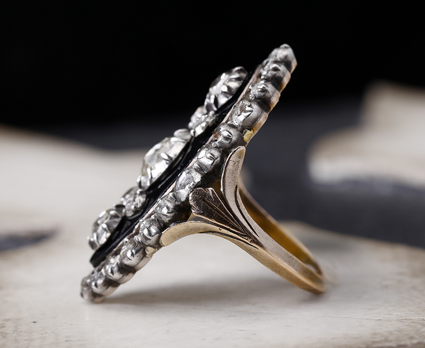 リング本体は18kでできており、ローズカットダイヤモンドはシルバーでセットされています。