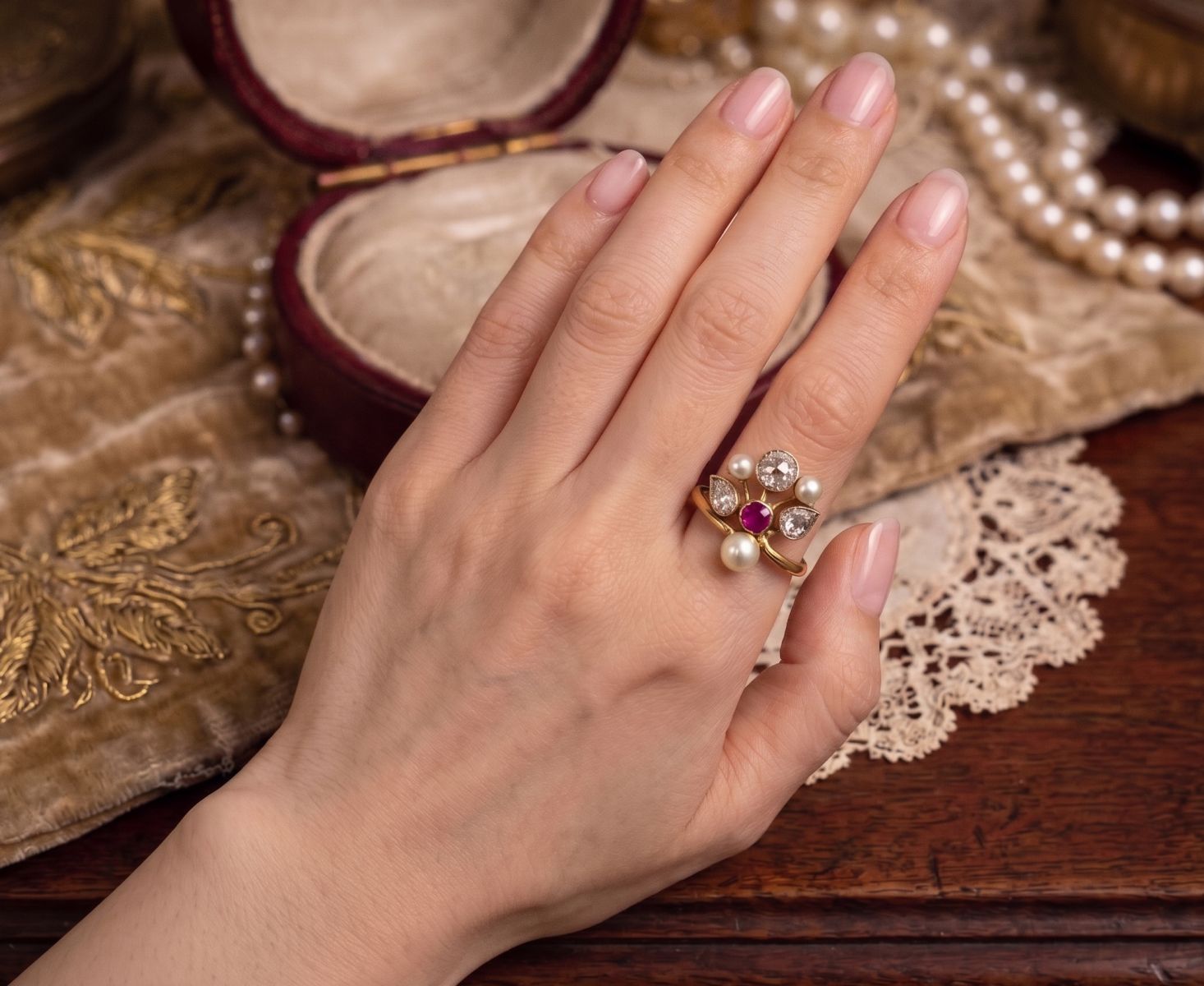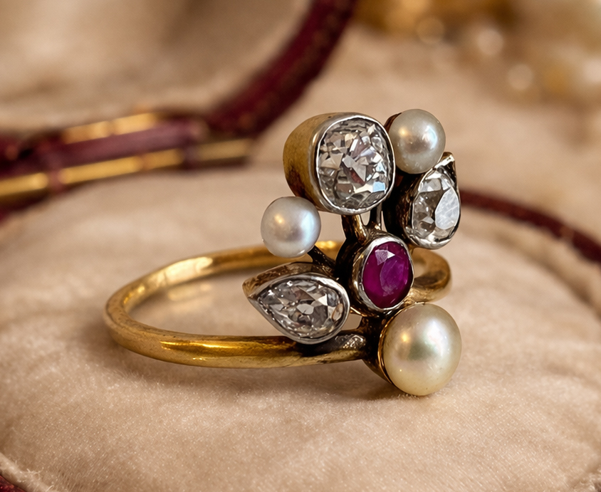 ダイヤモンド、ルビー、真珠、それぞれの素材の美しさがリングの魅力を引き立てています。